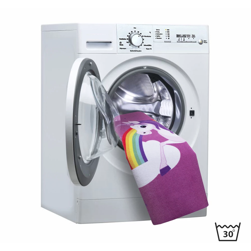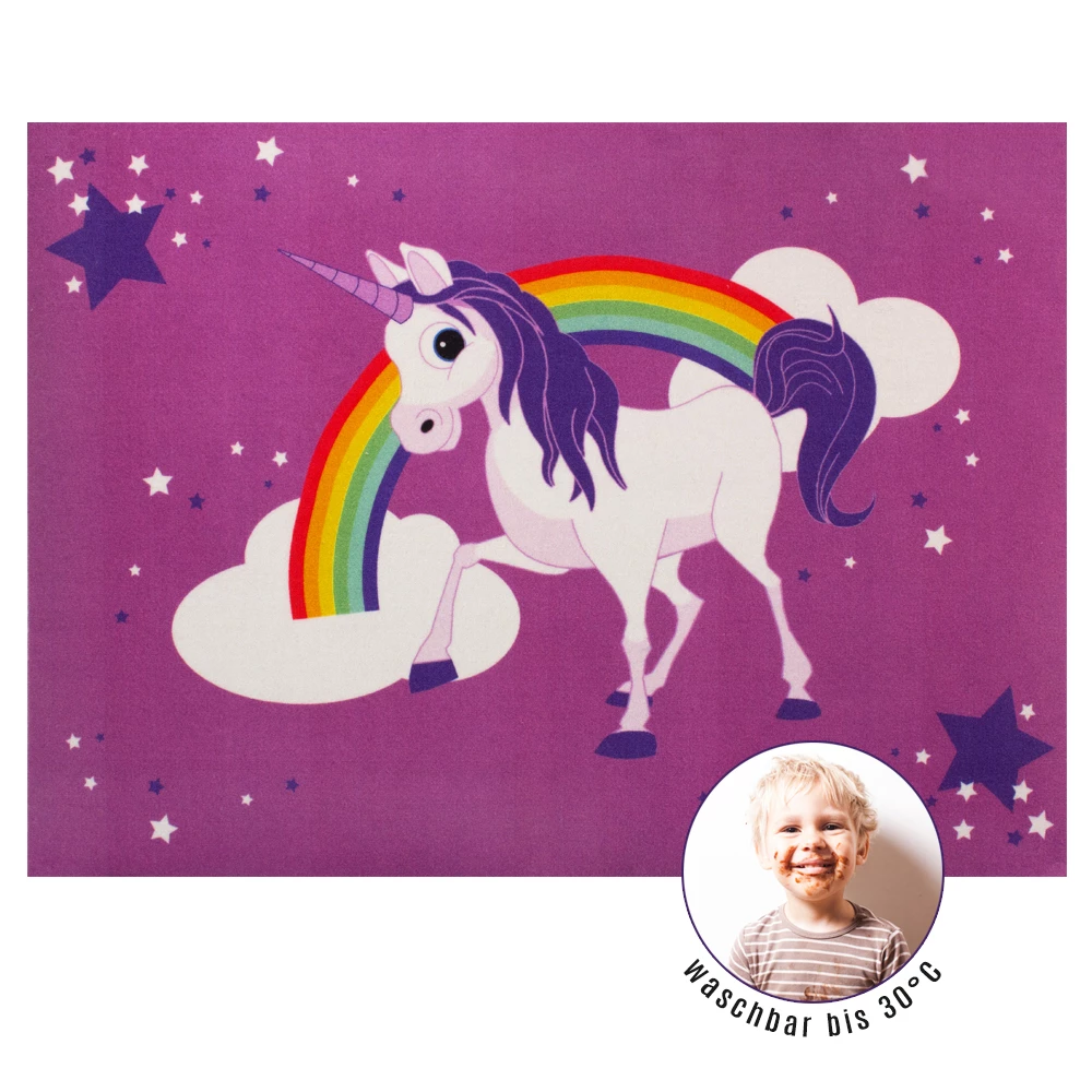 Mit diesem niedlichen Kinderteppich sorgen Sie in jedem Kinderzimmer für eine fröhliche Stimmung. Das angesagte Einhorn-Motiv mit Sternen und buntem Regenbogen im Hintergrund zaubert Mädchen im Handumdrehen ein Lächeln ins Gesicht. Auch Eltern werden diesen Teppich lieben – durch seine Waschbarkeit bei 30°C kann der Teppich ganz einfach gewaschen werden. Somit bleibt der Spielspaß auch lange nach dem Kauf erhalten. Der Einhorn Teppich hat einen ca. 4 mm hohen Flor, der besonders pflegeleicht und strapazierfähig ist. Zusätzlich sorgt der gummierte Vinylrücken für genügend Trittfestigkeit auf dem Teppich und verhindert das verrutschen auf dem Boden.