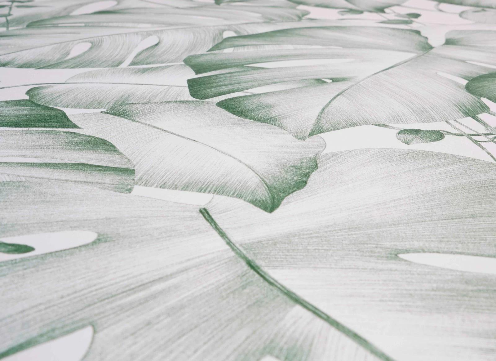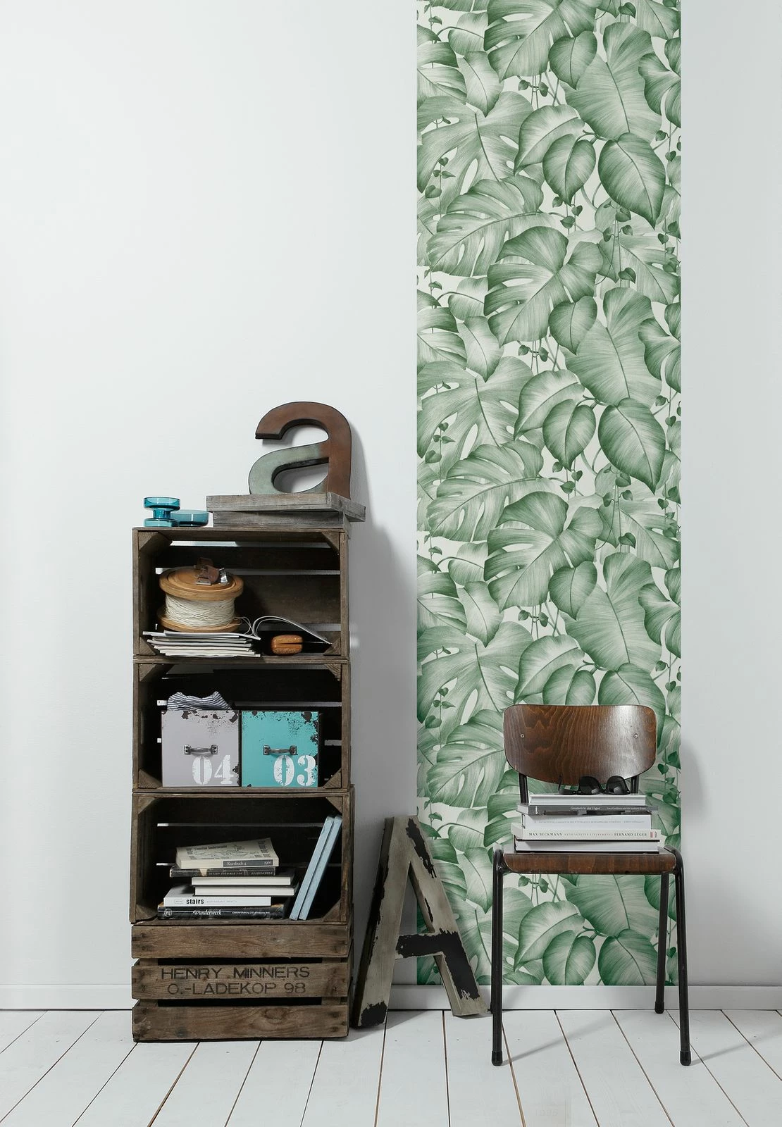 Die selbstklebenden Tapeten von livingwalls sind vielfältig einsetzbar. Sie verschönern nicht nur Wände, sondern können auch auf Schränken, Schlüsselboards und Türen angebracht werden. Ebenfalls können die Tapeten auch auf Raumtrenner geklebt werden und so für einen wahren Hingucker sorgen. Die Dschungle Blätter in weiß und grün kann in schnellen Schritten angebracht werden und so in kürzester Zeit ein wahres Raumwunder bewirken. Das Trägermaterial muss im ersten Schritt 10cm breit abgetrennt werden, daraufhin wird die Tapete an die Wand positioniert und angedrückt. Dabei darf nicht vergessen werden, das Trägermaterial zeitgleich mit dem Andrücken abzuziehen.