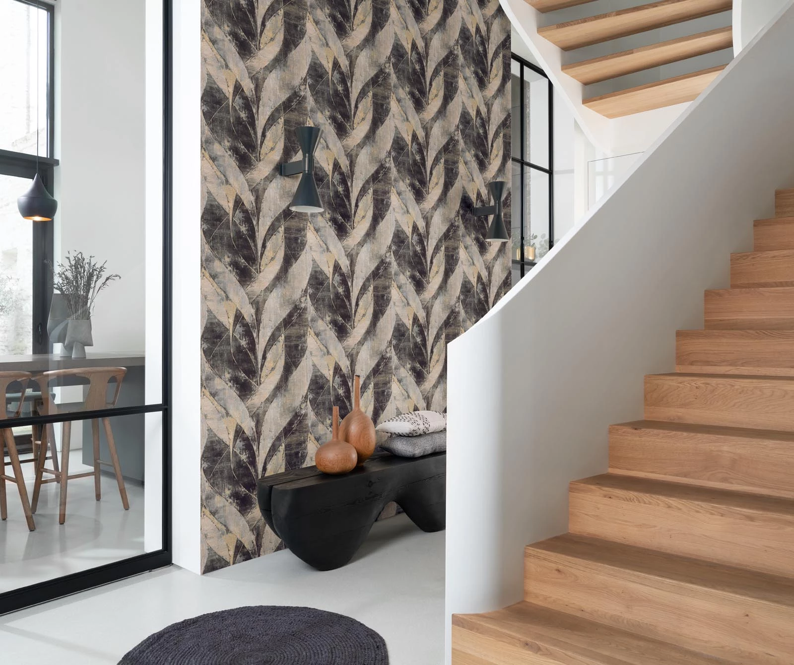 Wie von selbst fesselt diese in sich verschlungene Grafik mit dreidimensionalem Effekt den Blick des Betrachters an sich. Durch die extravagante Struktur und den feinen Glitzerauftrag in mattem Gold lässt diese Vliestapete in Anthrazit und Grau jedes Zuhause im Handumdrehen elegant und lebendig erscheinen.